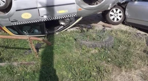 Ám hogy egyik autó sem ballagott, azt az ütközés intenzitása is igazolja, amelynek következtében a bérautó kiütött egy fából készült buszmegálló–bódét, majd feje tetején landolt a járda és az úttest közötti zöldövezeten, egy lakóház kapujának közvetlen közelében, ahol szerencsére épp akkor nem tartózkodott senki.