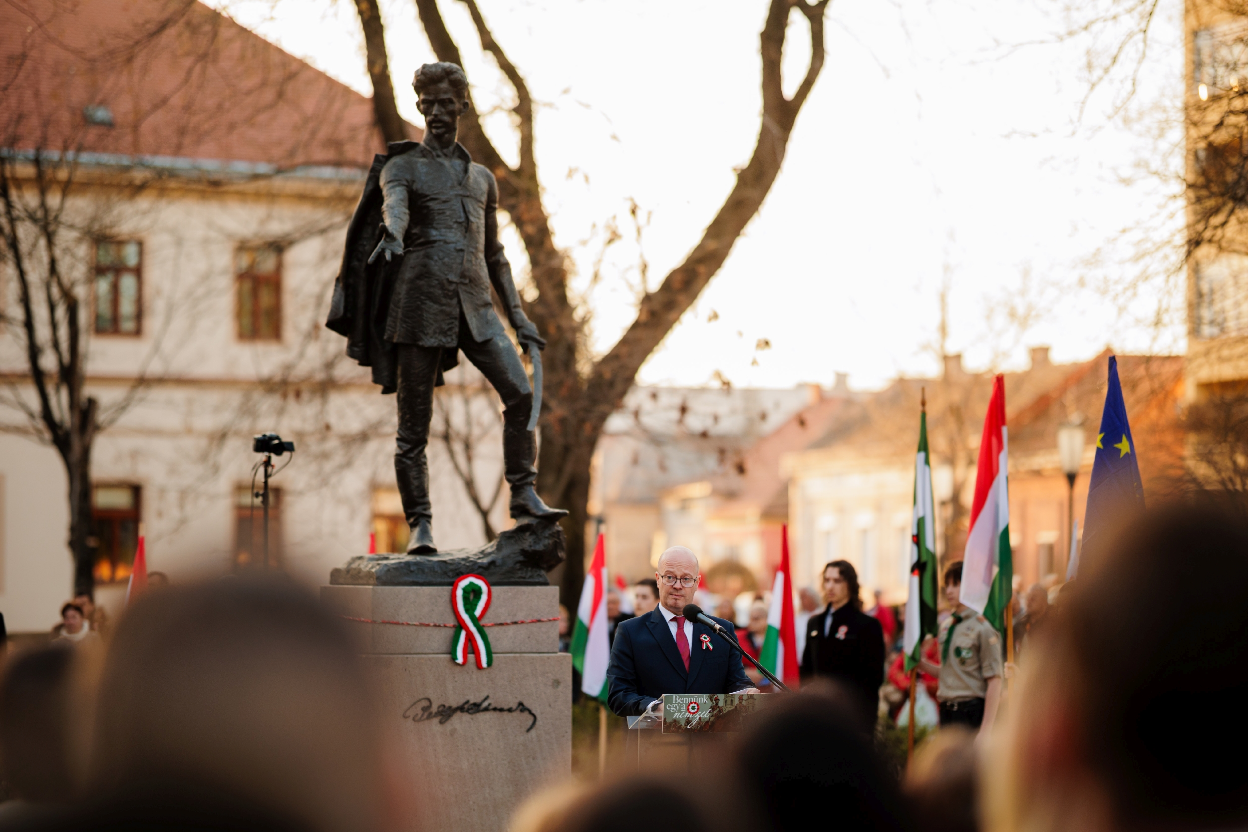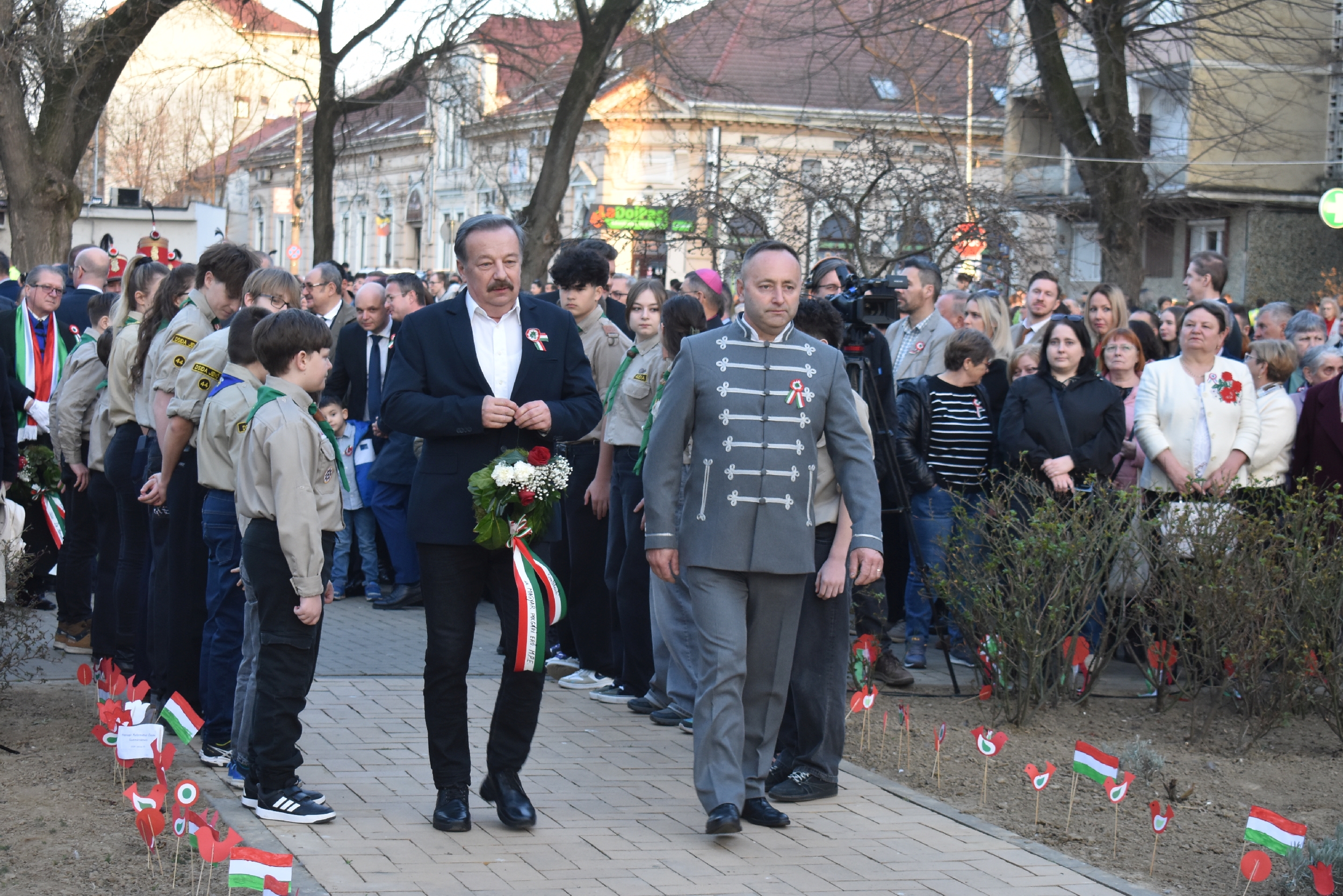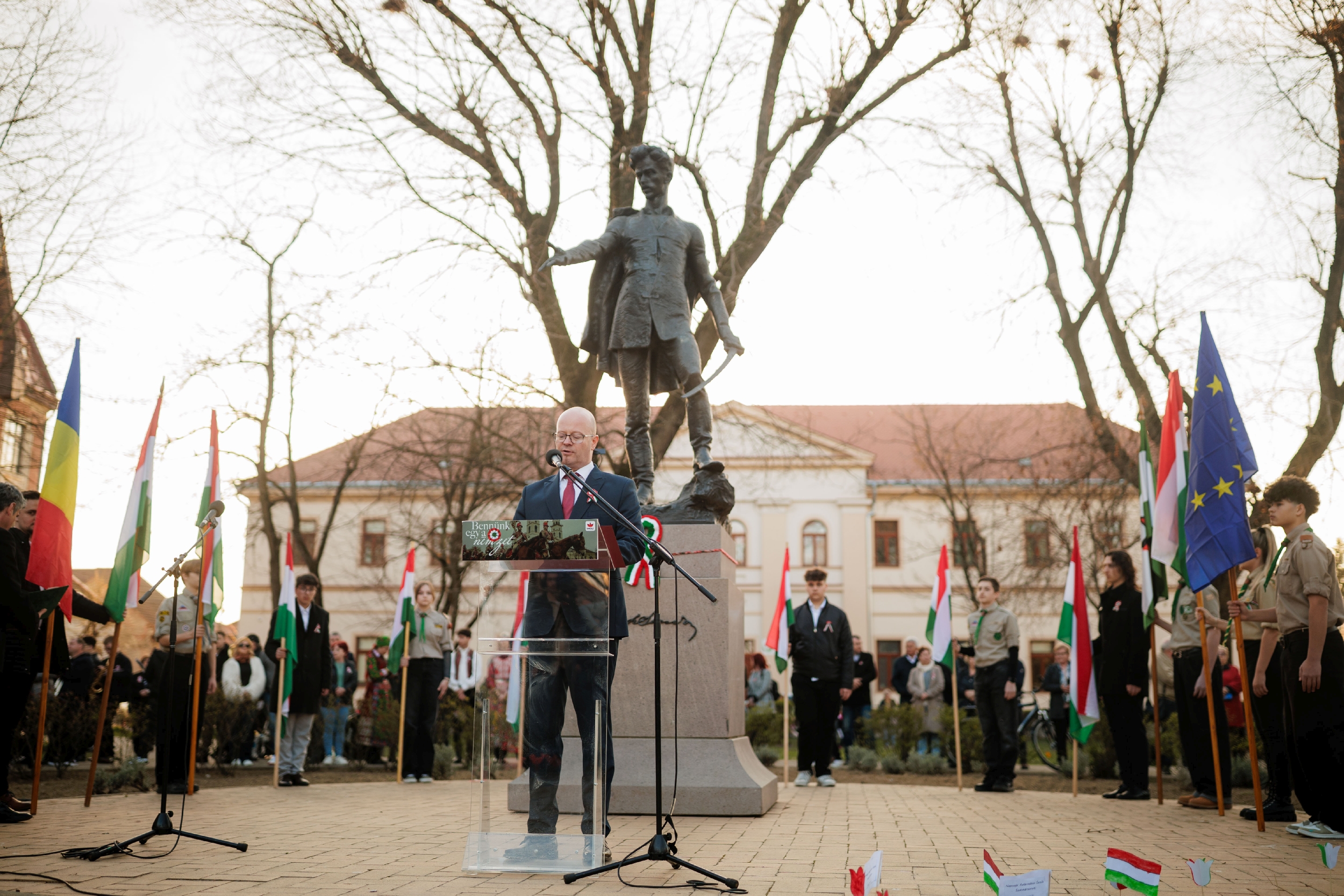 Ünnepi beszédében Pataki Csaba a megyei RMDSZ és a megyei tanács elnöke kiemelte: 1848 tavaszán elődeink olyan közös célokat fogalmaztak meg, amelyek mögé a társadalom legkülönbözőbb rétegei is fel tudtak sorakozni. A tizenkét pont nemcsak politikai követelés volt, hanem egy közös akarat kikiáltása; olyan akaraté, amely túlmutatott a vitákon, a különböző érdekeken, és amely egy egész nemzetet mozdított meg és állított csatasorba. Pedig akkor sem volt minden egyszerű. A reformkor vitákkal teli időszak volt, nézetkülönbségekkel és különféle érdekek állandó ütköztetésével. Mégis eljött az a pillanat, amikor mindenki felismerte: vannak ügyek, amelyek fontosabbak minden különbségnél és március 15-én ezért tudott megszületni az a történelmi egység, amely a modern magyar nemzet megszületésének alapját jelentette.