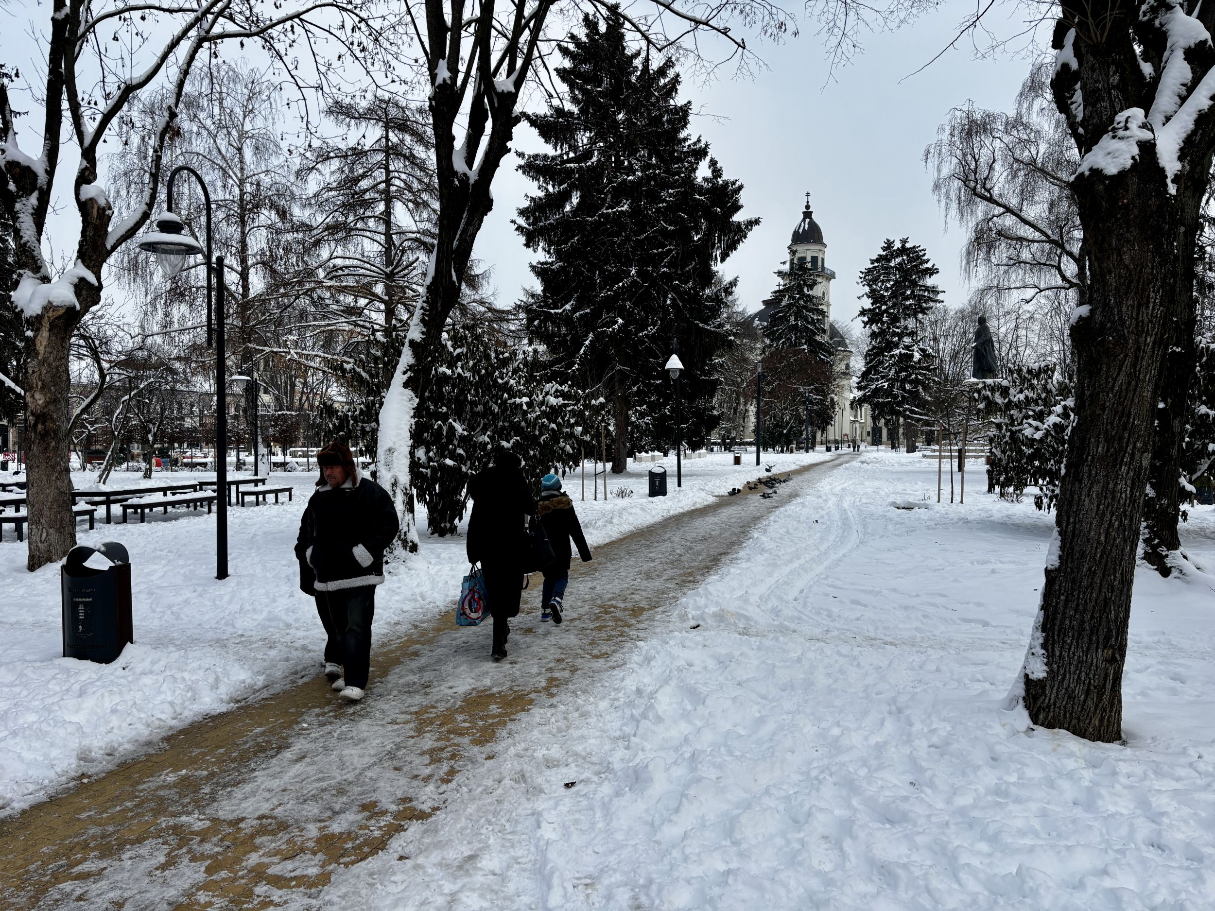 Szatmárnémeti ennek megfelelő autentikus képet mutatott vasárnap, tizenhat centi hóréteg borította az érintetlen területeket, embermagasságú hótömbök voltak ott, ahol eltolták a havat. Alig jártak emberek az utcán, az autós forgalom is mérsékelt volt, a hipermarketek és a bevásárlóközpont környékén volt nagyobb mozgás, egyébként minden és mindenki elcsendesedett a nagy hidegben.