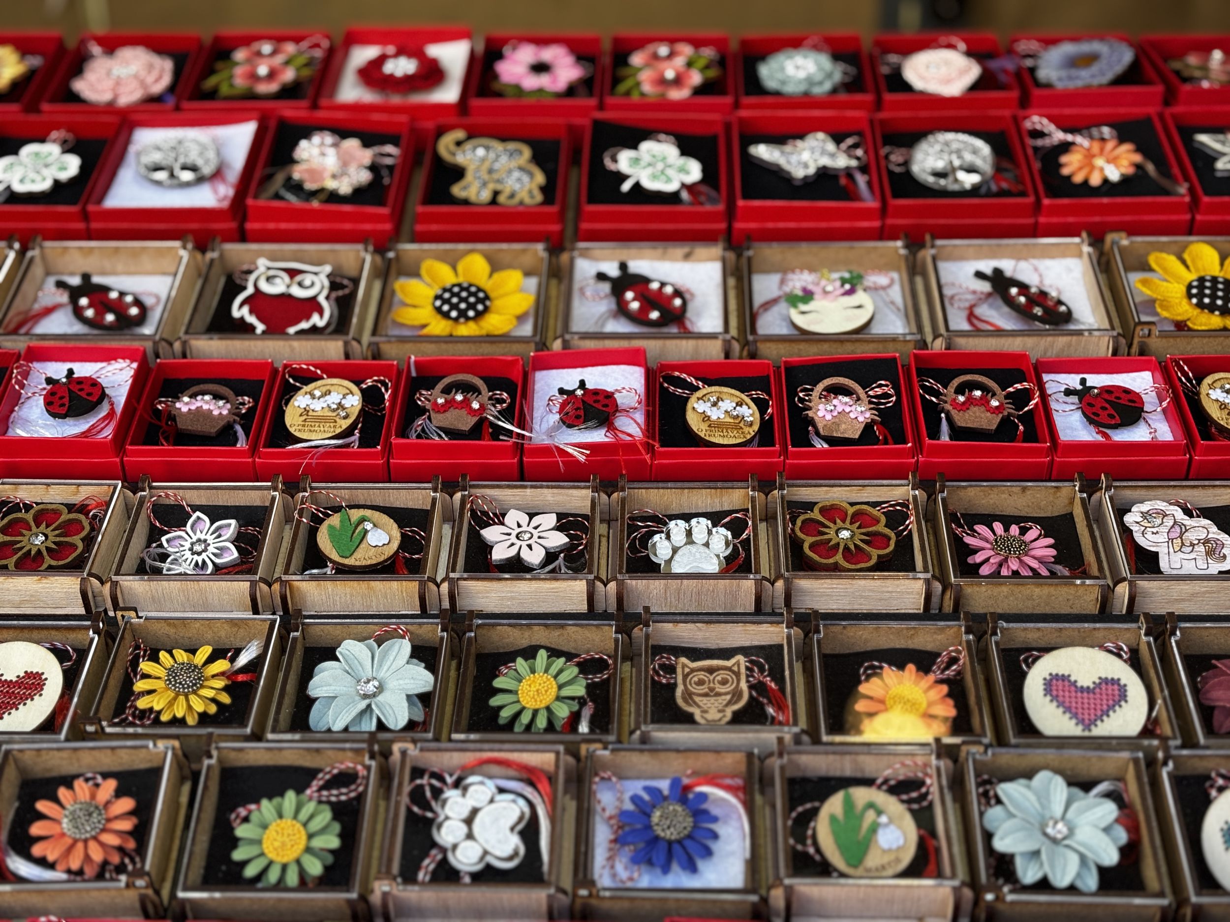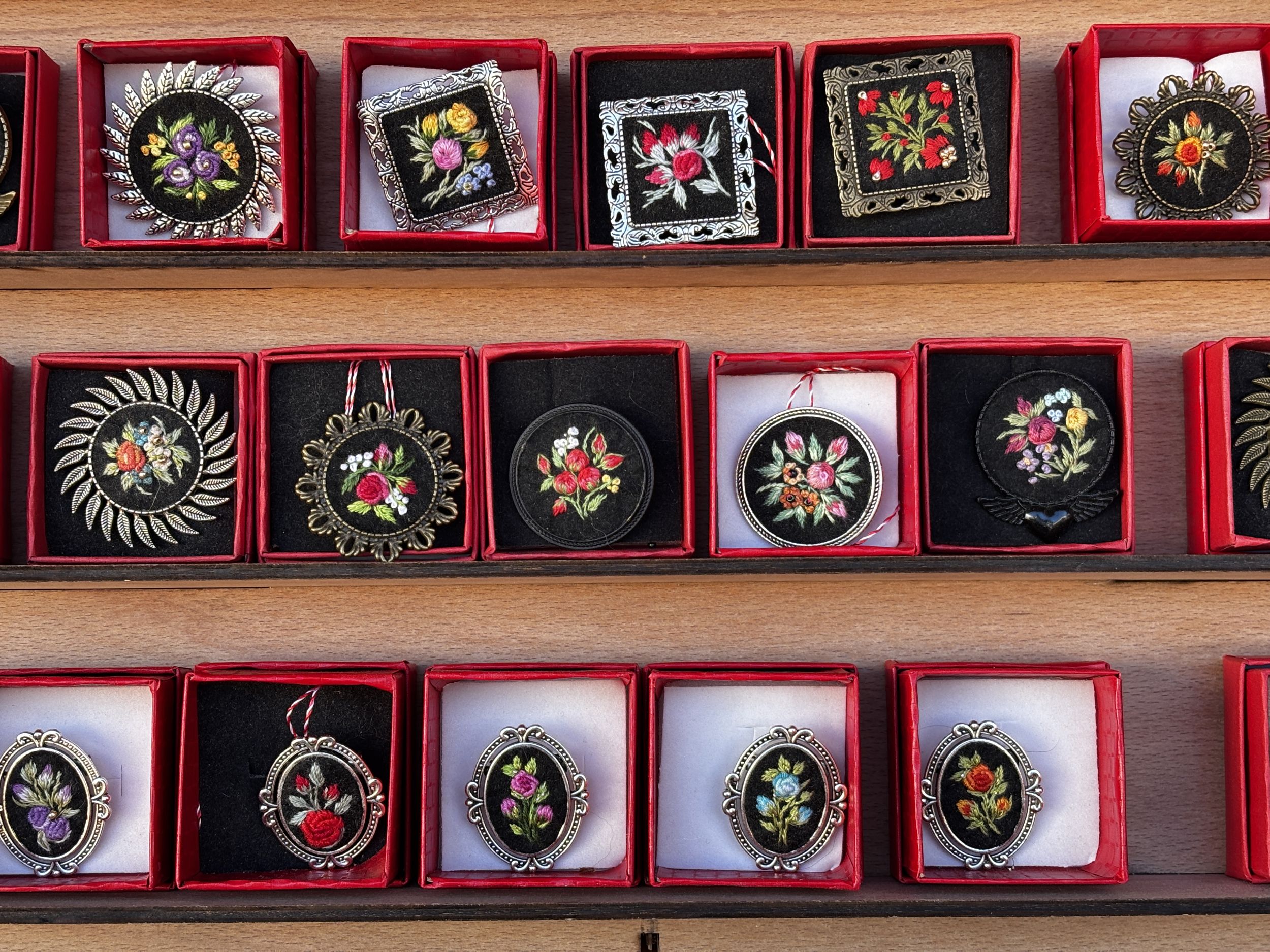 Vannak aprólékos munkával, nagyító alatt kézzel kivarrt medállal készült karperecek, fából készült kézzel festett virágdíszek, posztóra rögzített hímzett fabrossok, fülbevalószettek, nemezékszerek.