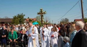 Az újonnan épült templomba bevonulva Jenő püspök megáldotta a keresztelőkutat, majd meghintette a népet szenteltvízzel.