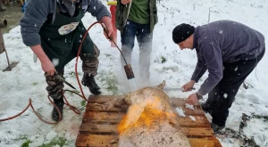 Természetesen a perzselés műveletével megkezdődött a butykosok körbejárása is, a hidegben a különböző „kedélyjavító” folyadékok belülről biztosították a jelenlévők kellemes közérzetét — és egyúttal a Hornyák Tibor, Huszti Gyula, Butka Sándor alkotta italzsűrit is munkába állították, hiszen végigkóstolva a 37 csapat fogó– és vendégfogadó pálinkáit kellett dönteniük, melyik is a legfinomabb.