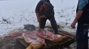 Közben pedig dolgoztak a kések, villanásuk nyomán darabolódtak a húsok, kikanyarítódtak a sonkák, szeletelődtek a karajok — a leggyorsabban Mezőterem villámkezű böllére, Hart Tamás dolgozott, aki sopperoltan 7 perc alatt „kapta szét” a disznót.