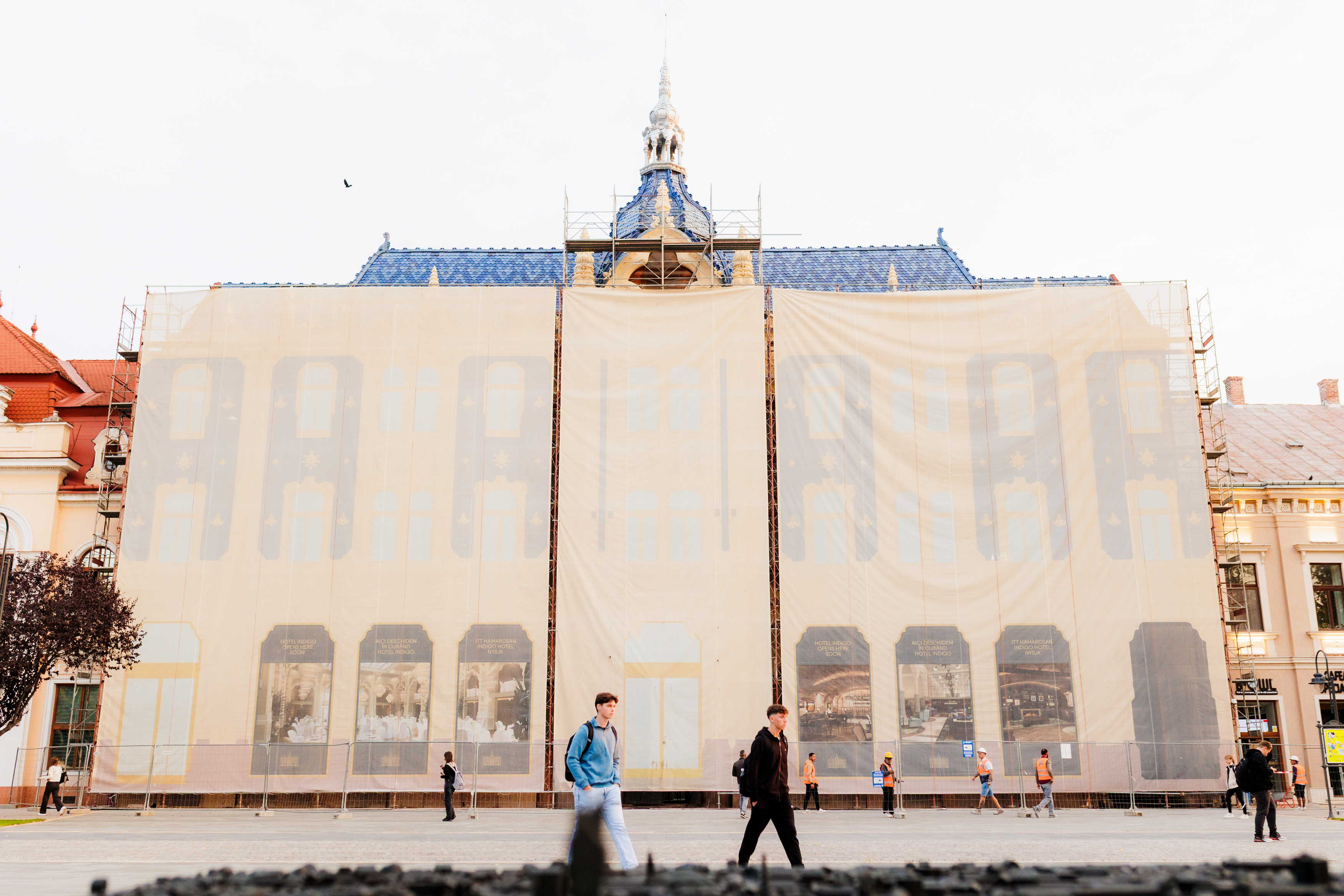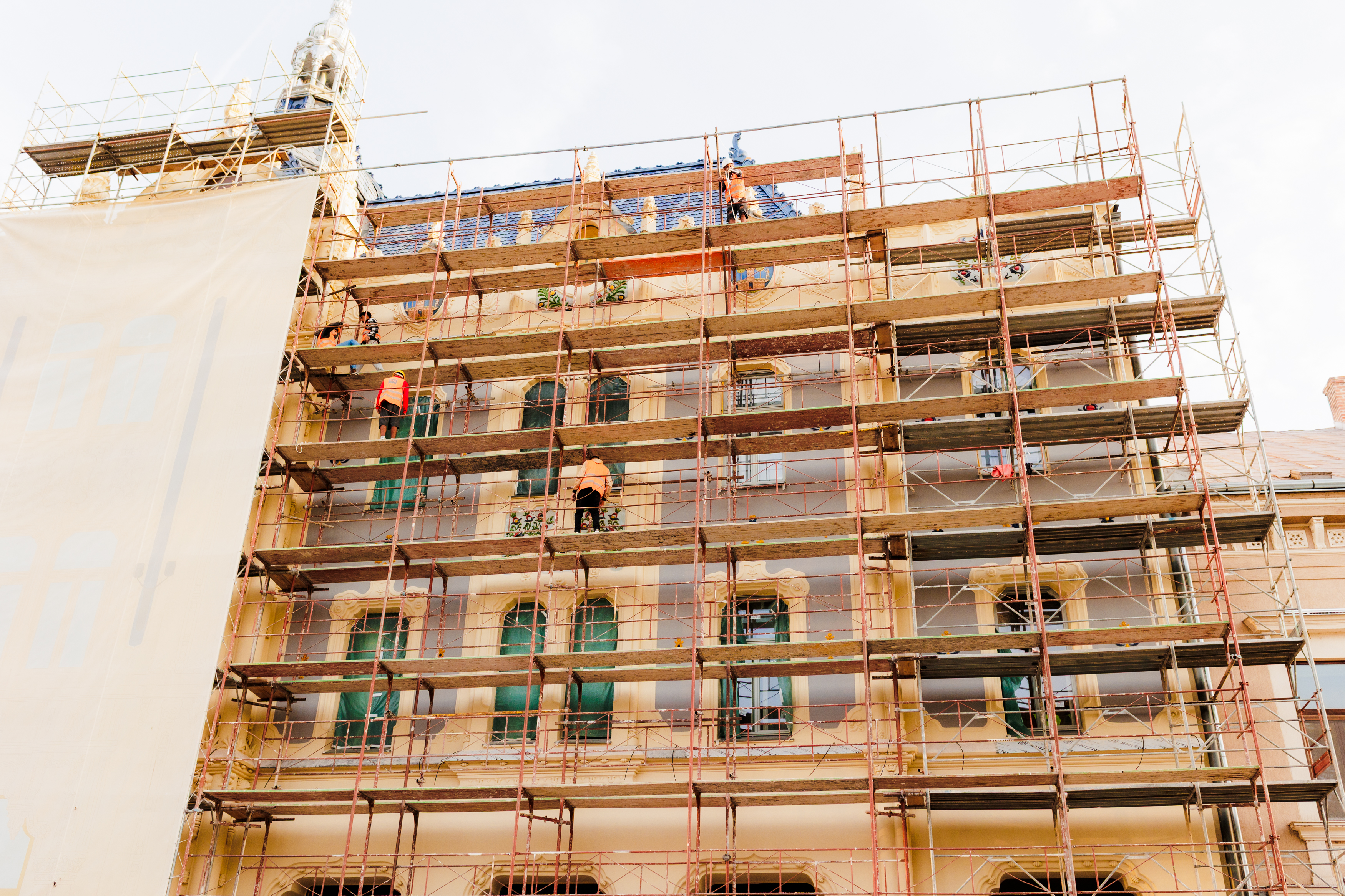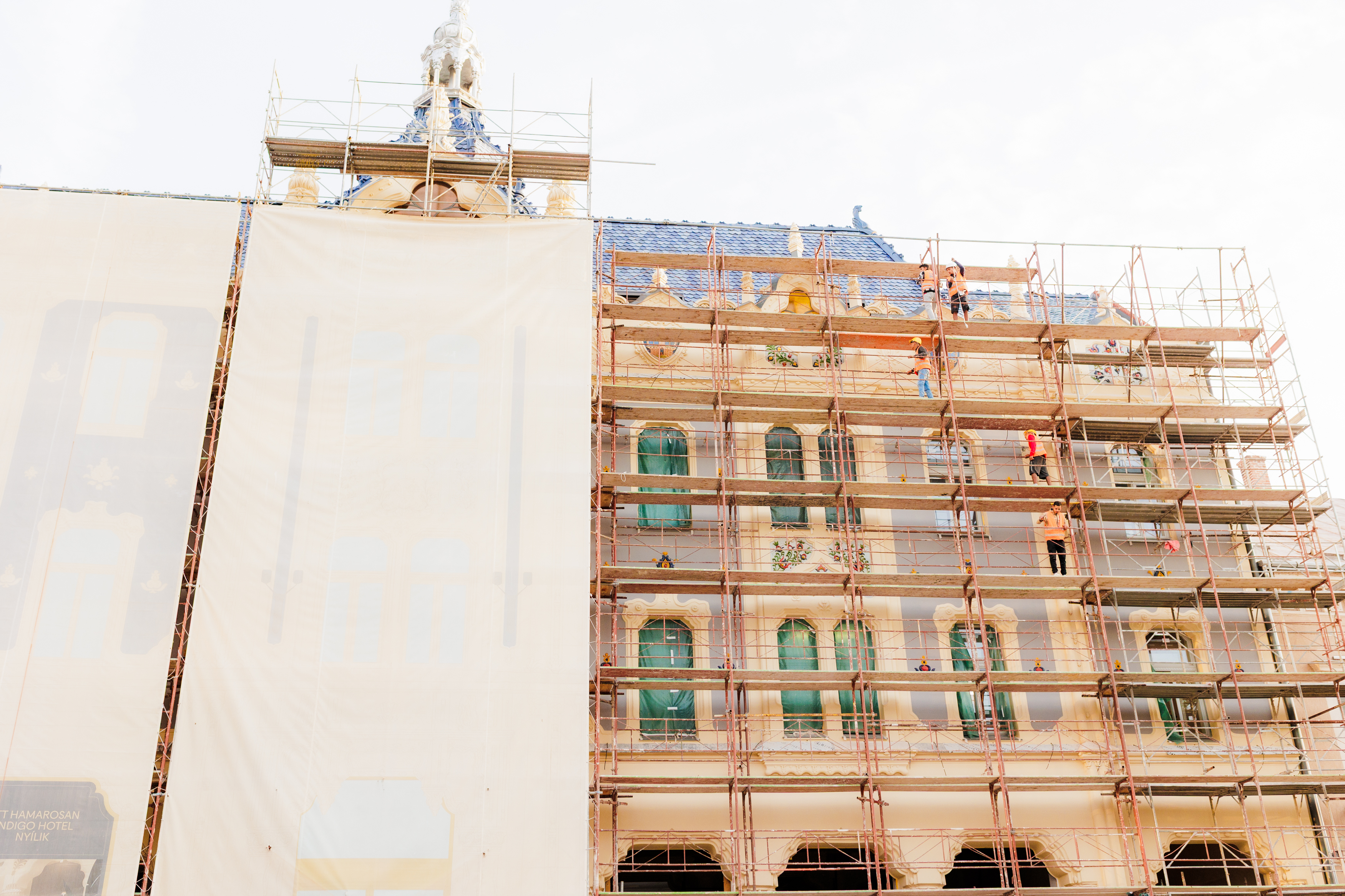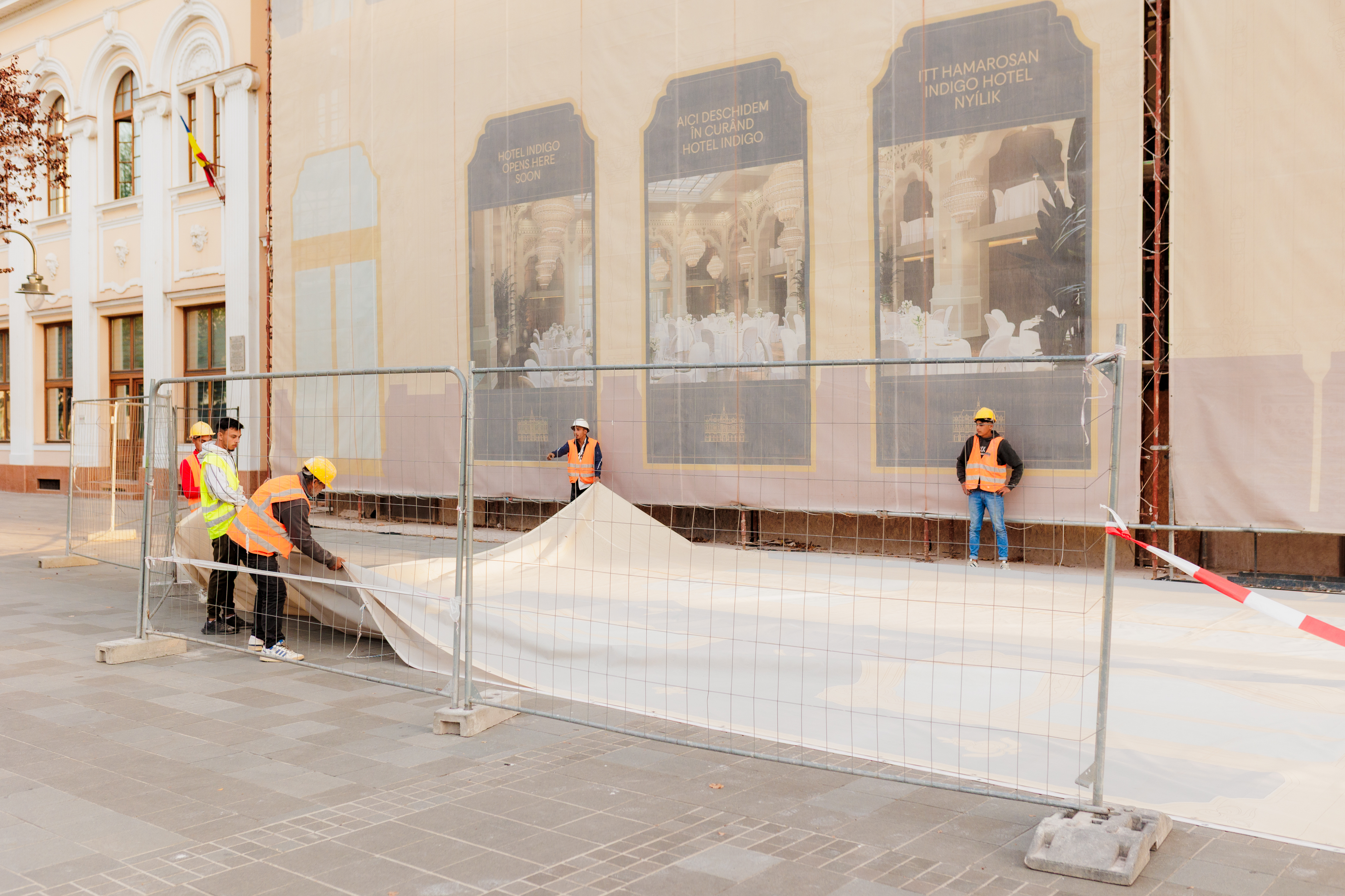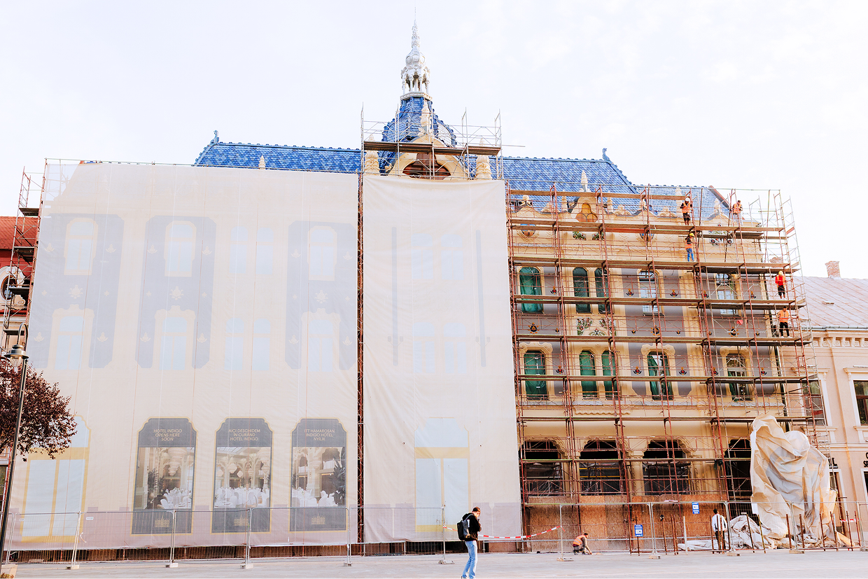 Szerda reggel elkezdték visszabontani a szatmárnémeti egykori Pannónia, majd Dacia, illetve hamarosan Hotel Indigo nevet viselő patinás műemléképület homlokzatát borító molinót és az állványzatot.