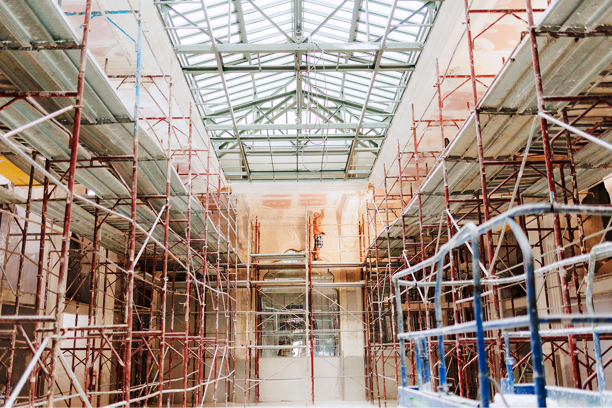 A beltérben még dolgoznak, a polgármester szerint 8 hónapra van még szükség a befejezésig, 2026 májusában várható, hogy elkészül és használatba lesz adva a szállodai és vendéglátóipari célra visszaállított épület.