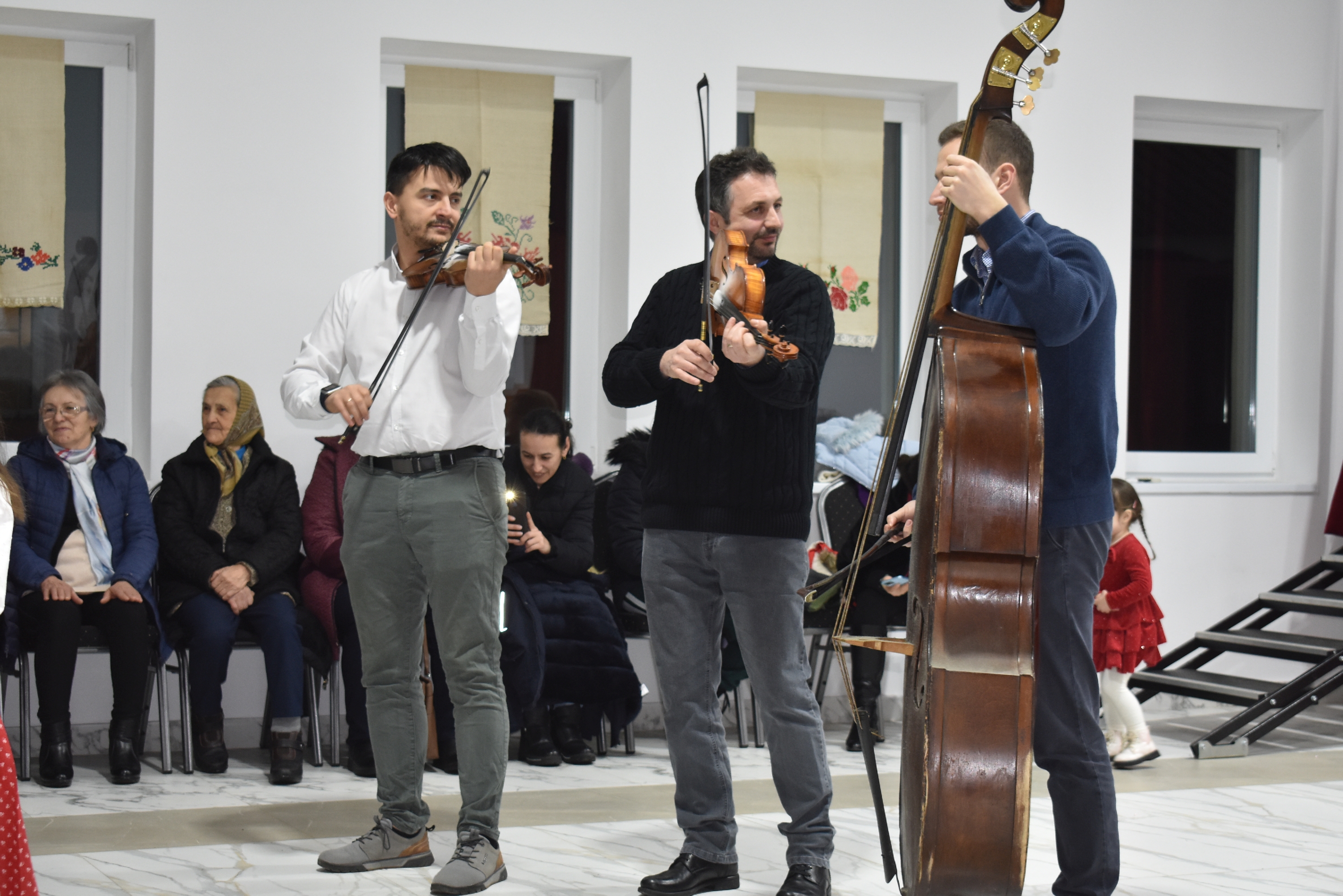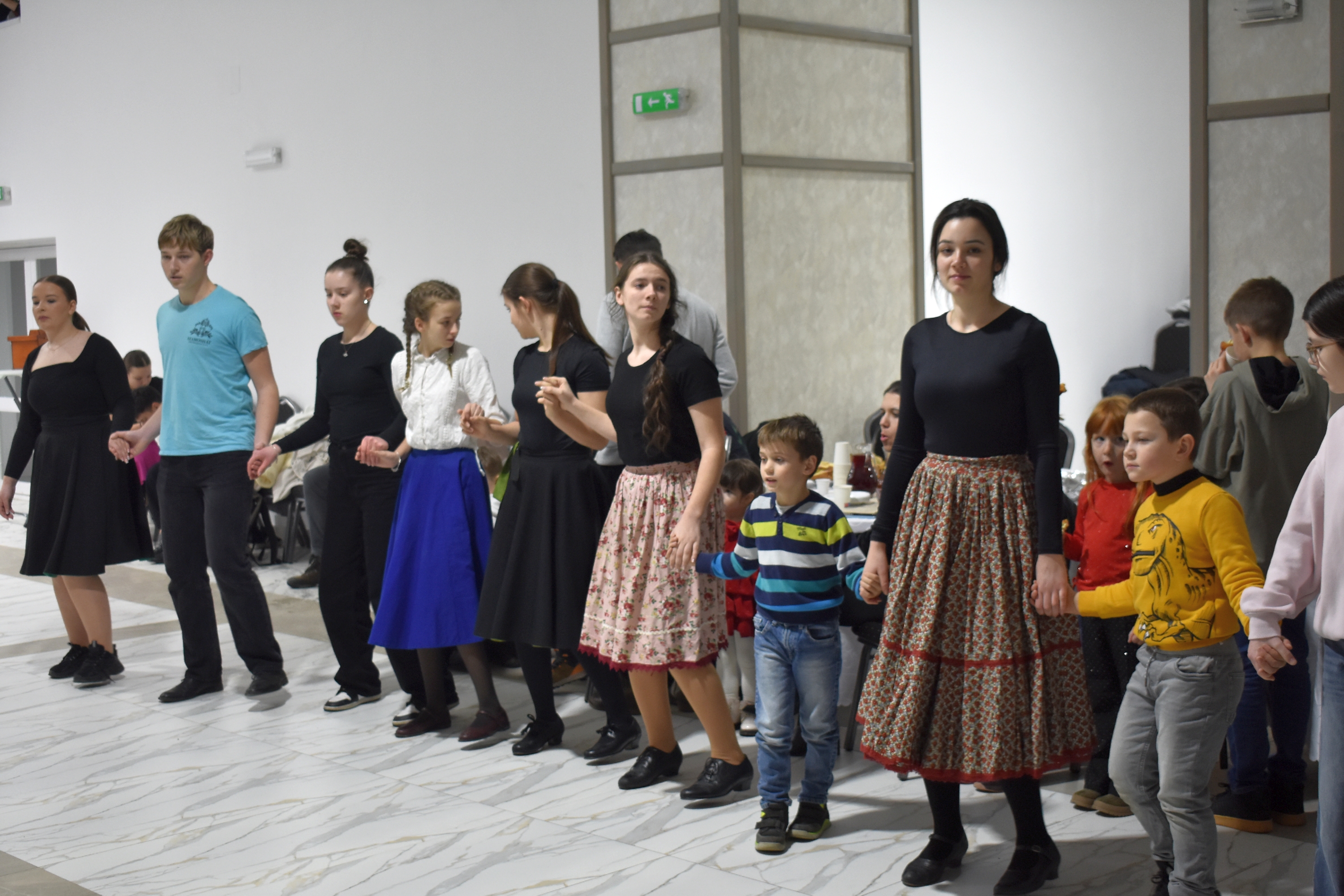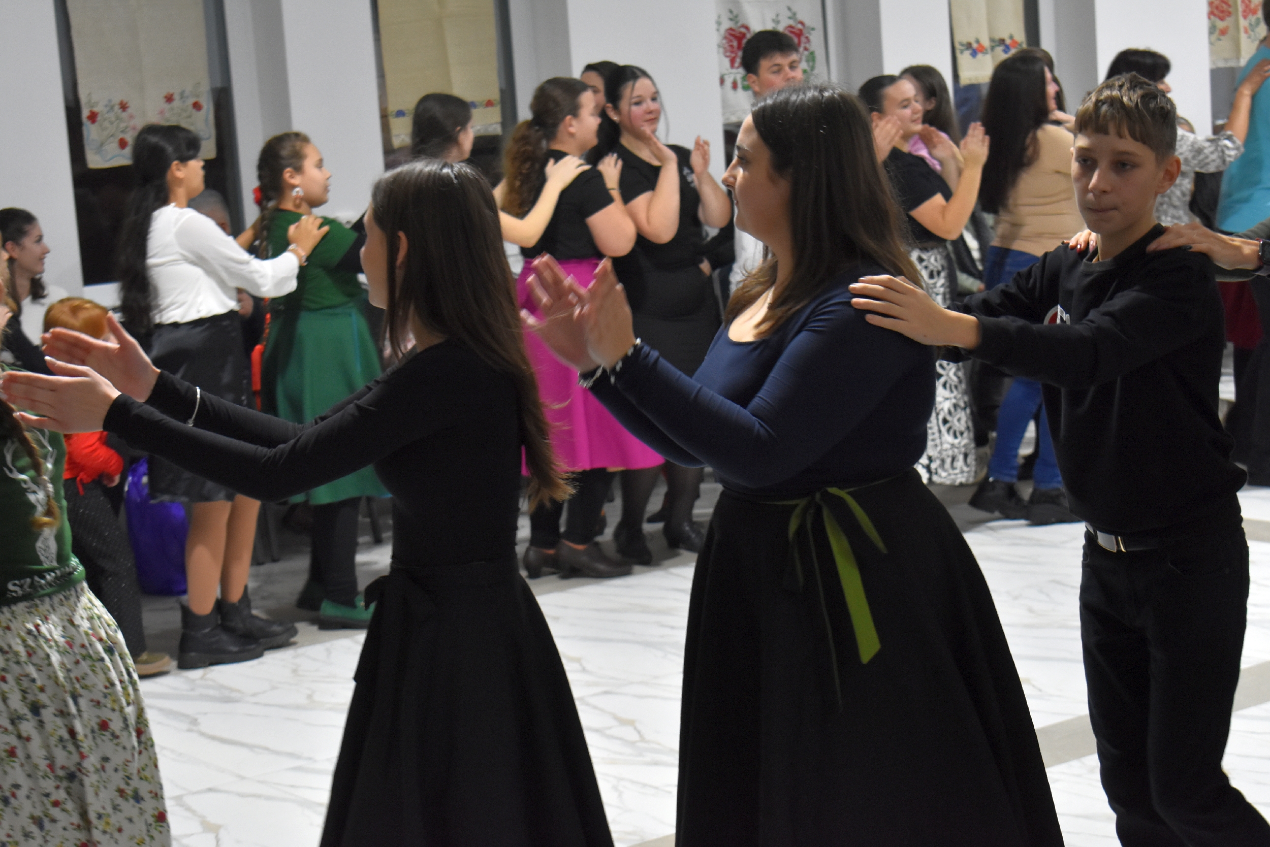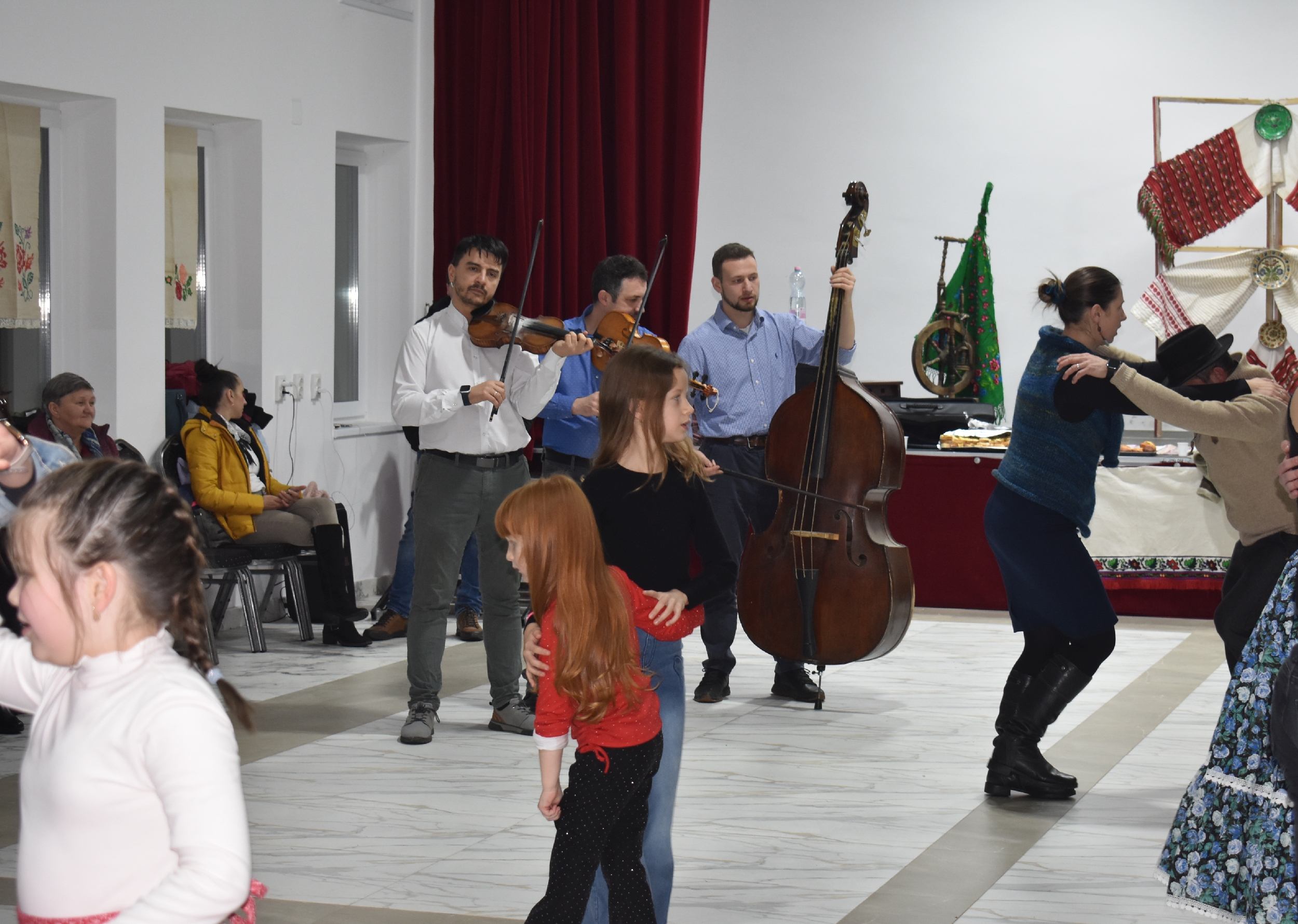 A nem csak aprónépeknek szóló gyermektáncházban moldvai táncokat és népi gyermekjátékokat jártak a Debrecenből érkezett Jeremiás Kincső oktató vezetésével a nagyváradi Soroglya zenekar muzsikájára. Aztán bemelegítésként pörgő ritmusú szatmárit – még a fánksütésben meg nem fáradt nőszövetségi tagok is táncra perdültek – , szilágyságit, kalotaszegit, mezőségit és bonchidait.