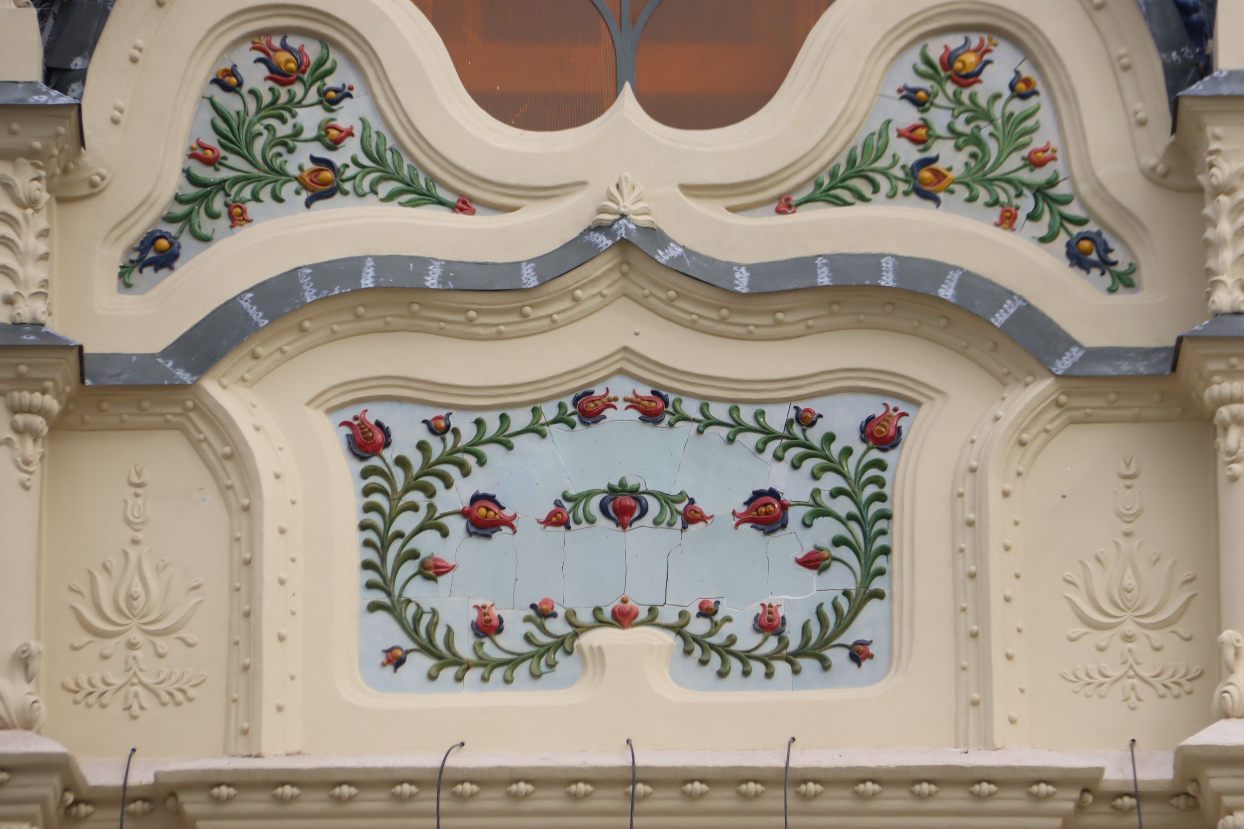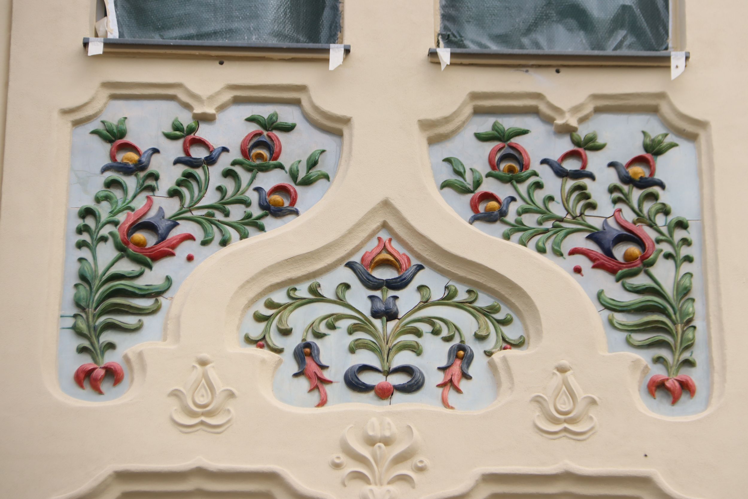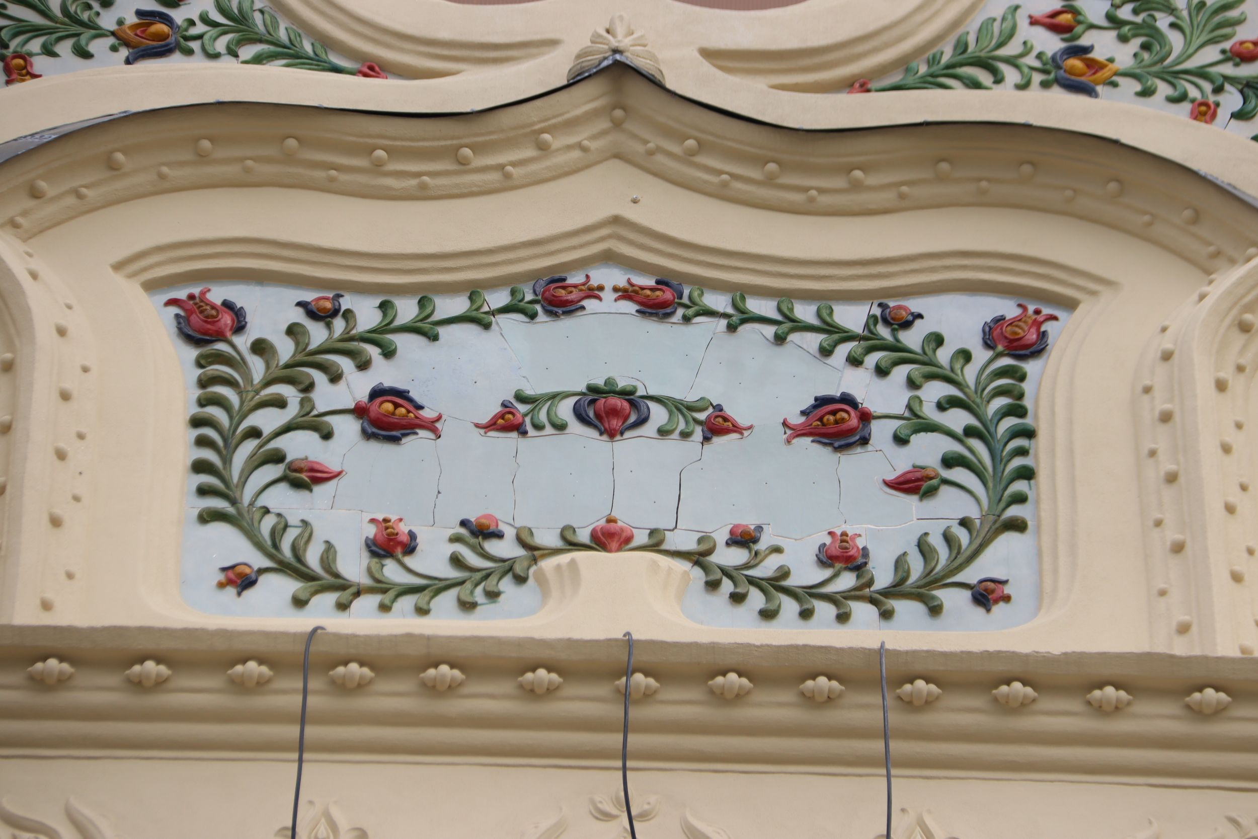 A homlokzaton egyébként annyi a dísz, mint amennyi egy barokk festményen, manapság szobafalat nem díszítenek ki annyira az emberek mint annak idején díszítettek 15 – 20 méteres magasságig is egy épületfrontot.
