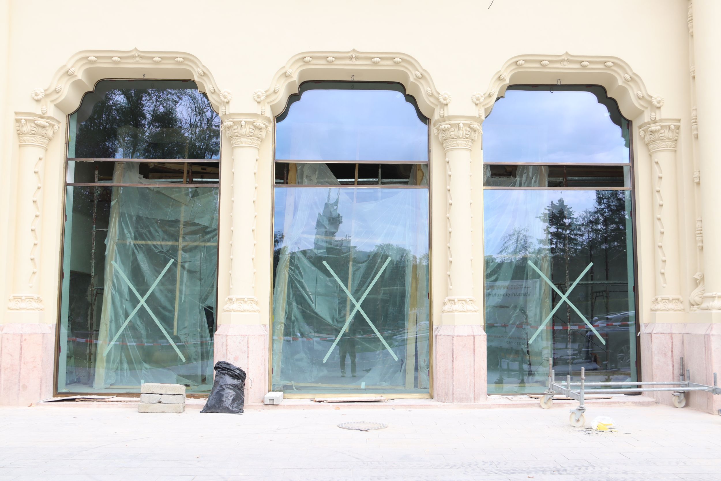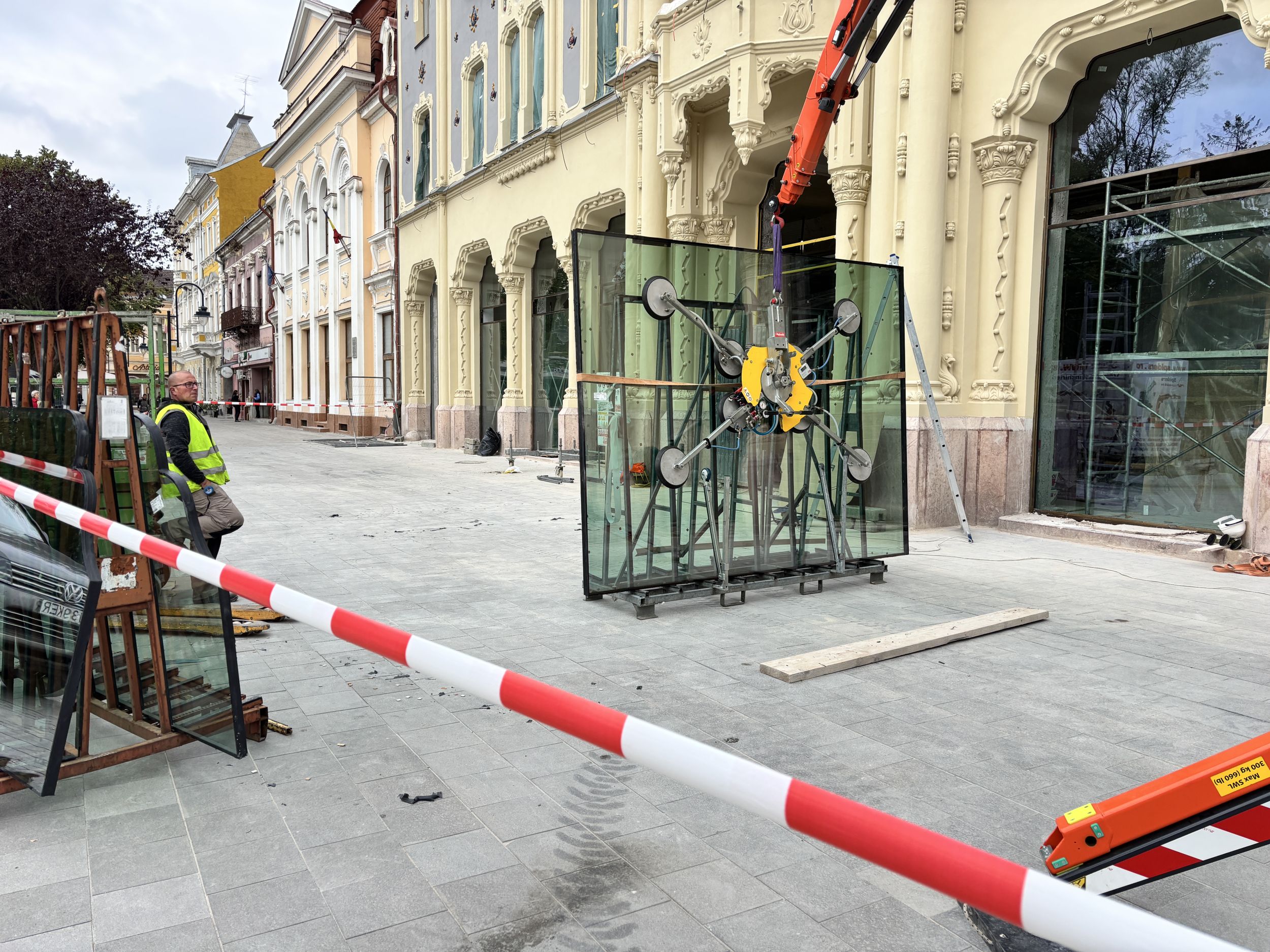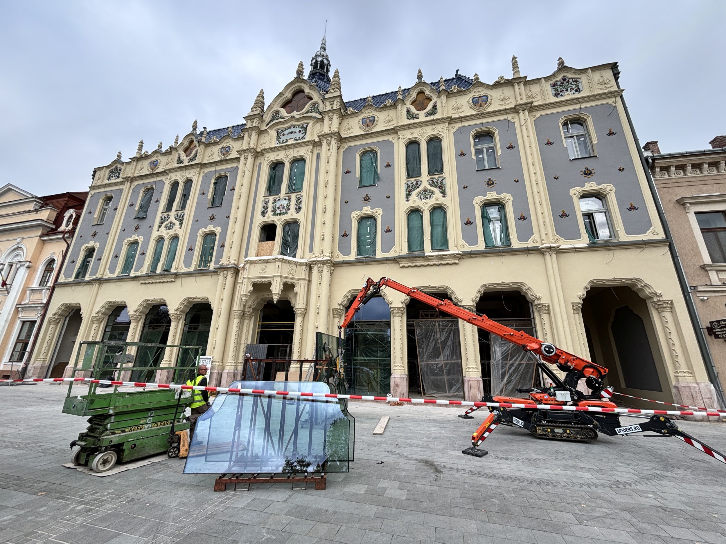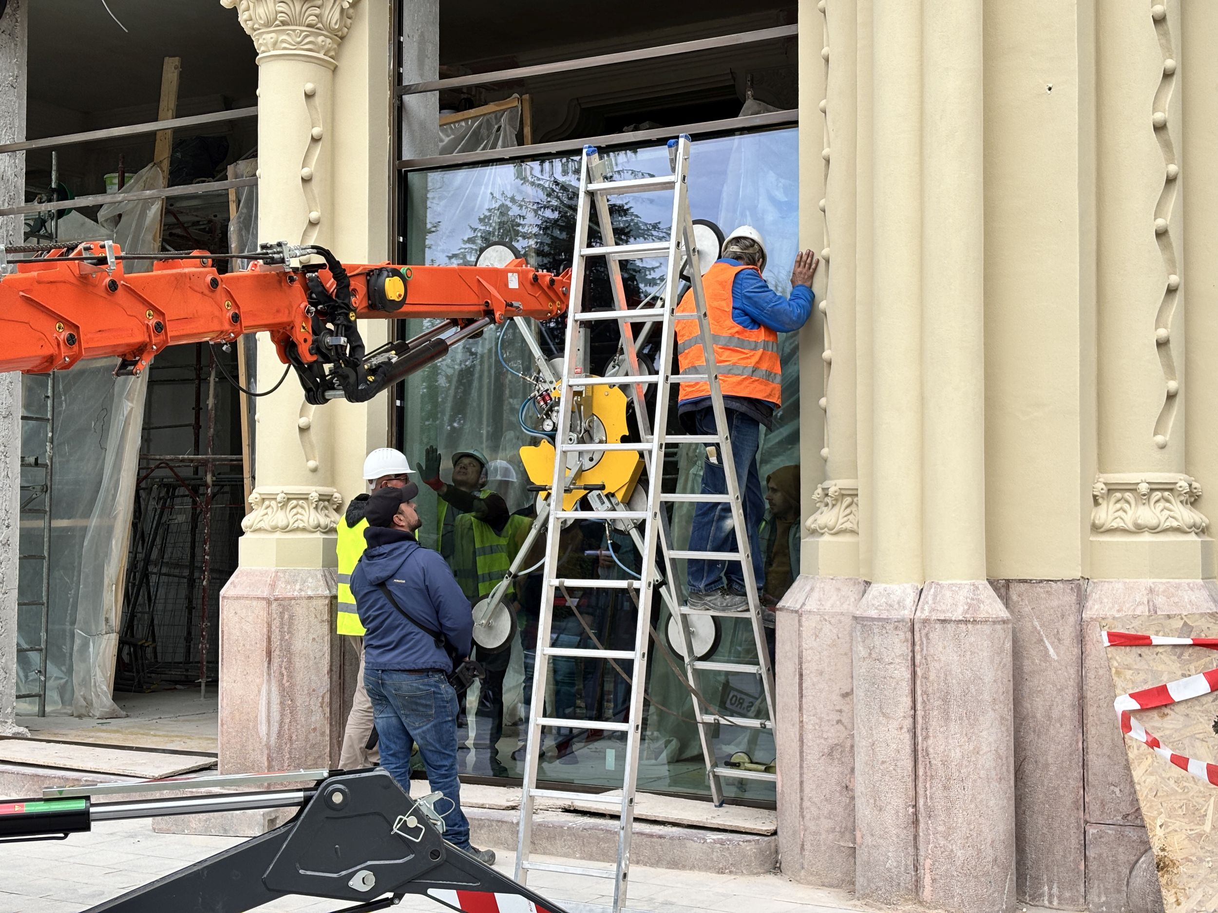Ebben az időszakban a munka utolsó 1 százalékán dolgoznak az épületfronton: speciális, távirányítású robotkarral teszik a helyükre a földszint hatalmas, 4x5 méteres vitrin-üvegeit. Időigényes munkafázis, amellyel sietni nem lehet, de hamarosan végeznek, mondják.
