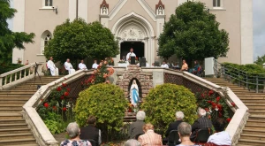 A Kálvária-templom bejáratánál felállított oltárhoz visszatérve a Te Deum és az engesztelő imádság után Schönberger Jenő püspök az oltáriszentséggel adott záróáldást.