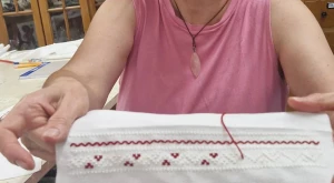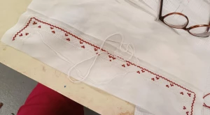 A kíváncsiabbja pedig azt sem mulasztotta el, hogy be–beszaladjon vagy kukucskáljon a Borókagyökér műhelyébe, ahol az Erdélyi Hagyományok Háza támogatásával valami egészen különleges készült: a csángó népviselet sajátos darabját, az egybeszabott ember-inget vagy emberes-inget készítették Popa Zsolt viseletkészítő irányításával. A Röpike társ–vezetője és oktatója, Kása Melinda azonban nem csak bekukucskált a képzésre, hanem kisfia számára meg is varrta, ki is hímezte a magyar, s főleg erdélyi magyar viseletekre jellemző ruhadarabot — egyrészt mert vidékünkön nem található, másrészt ritka alkalom, hogy néptáncos készíthet maga vagy családtagja számára népi ruhadarabot.