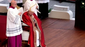 A mise első része után az eucharisztiát Giovanni Battista Re bíboros celebrálta az oltárnál — egy ideje ez már így történik a pápa által vezetett miséken, ugyanis Ferenc pápának térdproblémái vannak, és a celebránsnak a szentáldozáskor le kell térdelnie.